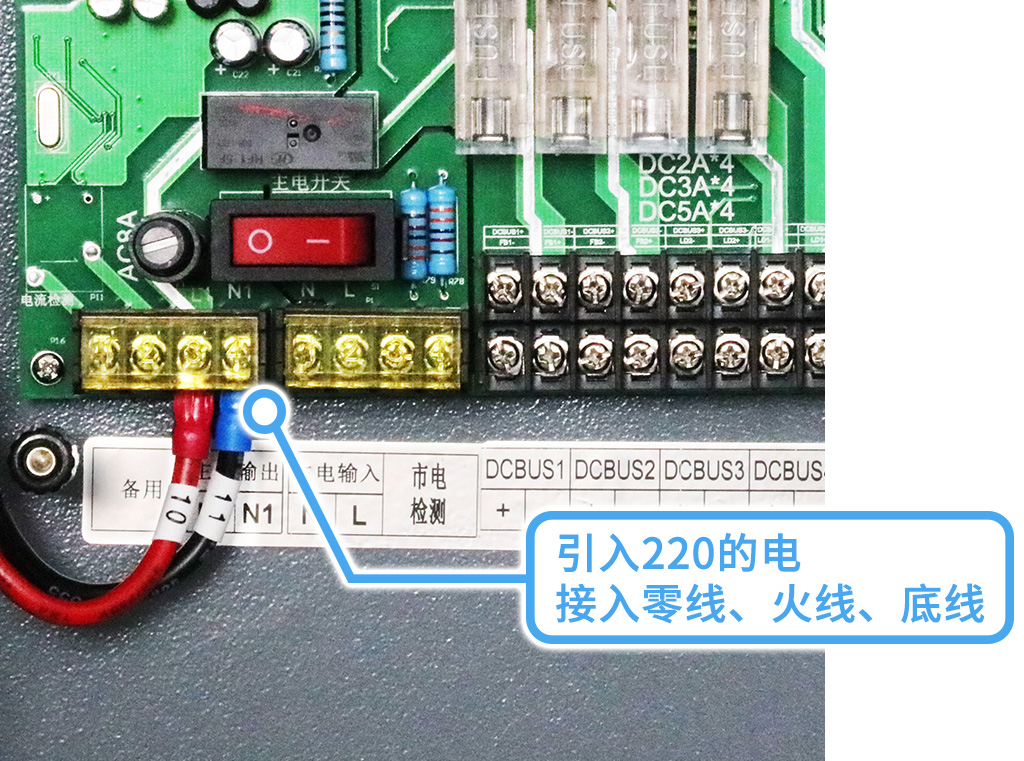 主电部分:先在消防箱引入220的电,接入零线、火线、地线;